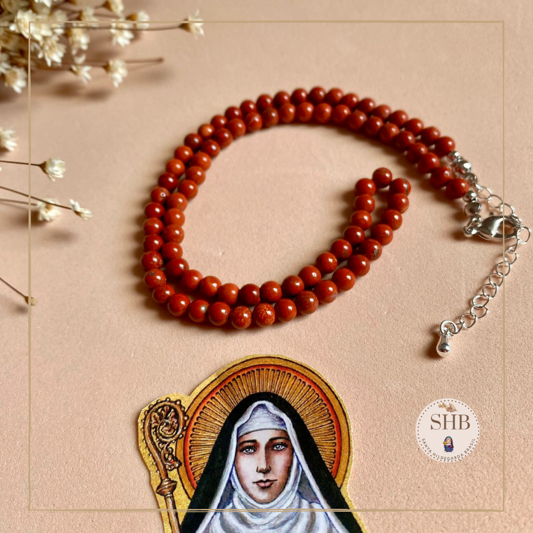 Produtos elaborados artesanalmente (terço, pulseiras, choker) inspirados nos ensinamentos de Santa Hildegarda de Bingen, Santa e Doutora da Igreja Católica.